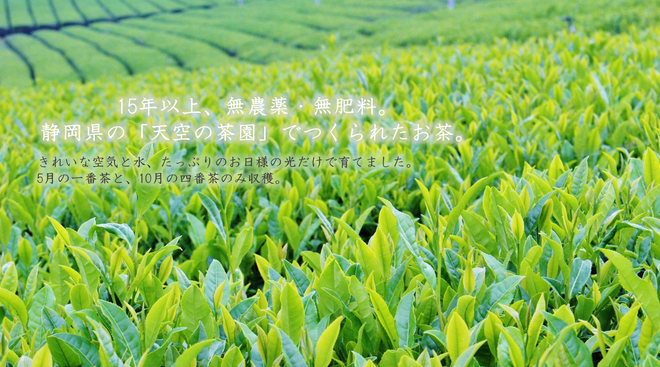 15年以上、あらゆる農薬・肥料・化学合成資材・微生物資材一切不使用。きれいな空気と水、たっぷりのお日様の光だけで、育てられているお茶。